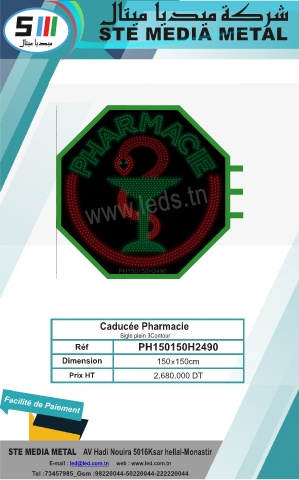 Caducée Pharmacie Sigle plein 3Contour Réf PH150150H2490 Dimension 150 x 150cm Prix HT 2.680.000 DT STE MEDIA METAL AV Hadi Nouira 5016Ksar hellal-Monastir E-mail : led@led.com.tn web : www.led.com.tn Tel :73457985_Gsm :98220044-50220044-222220044